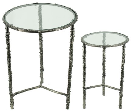 A silver antique finish lends a touch of glam to this set of two side tables, which is comprised of one small and one large accent table with round tops. Made of aluminum and glass, these simple accent tables are sure to fit right in with any décor.Read More