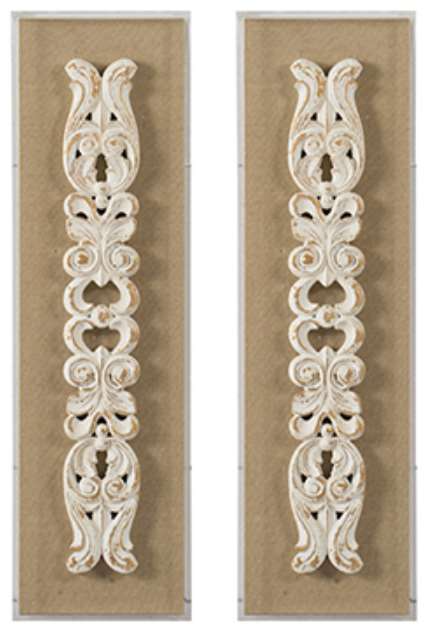 Add a stylish touch to your walls with this set of 3-dimensional scroll wall art in an antique-washed white finish. Delicate scroll designs create these traditional wood wall plaques. This set will enhance traditional and eclectic walls.Read More