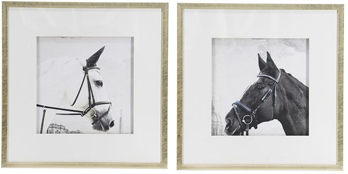 Show off your love of horses by decorating your walls with this set of two framed horse wall art in black and white. The black and white prints add contemporary depth to your walls. The gold finish frame lines the artwork to complete this lovely set.
