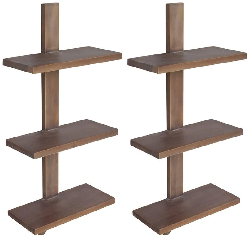 Add stylish storage to a modern office or living room with this pair of hanging shelves, which have a natural wood finish and three shelves apiece. These minimalist hanging shelves have central supports that hold all three horizontal tiers.Read More