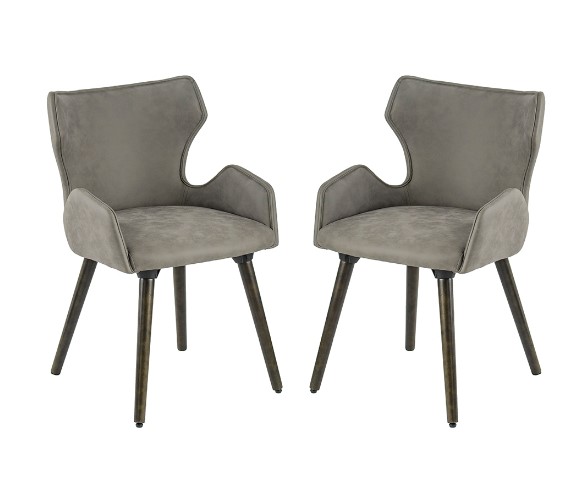 This set of two gray upholstered dining chairs was designed to provide a welcoming sense of luxury and comfort in the dining areas. Each chair has a wingback-style bentwood seat and back covered entirely in soft upholstery. Dark brown rubber wood legs offer visual contrast as well as strong support.Read More