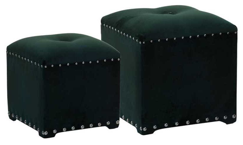 This set of two upholstered stools can lend elegance to any interior. Smooth green velvet upholstery, decorative silver nailheads, and plush padding come together to create irresistible appeal. Use as convenient occasional seating or place near a sofa or chair to serve as handsome footrests.Read More