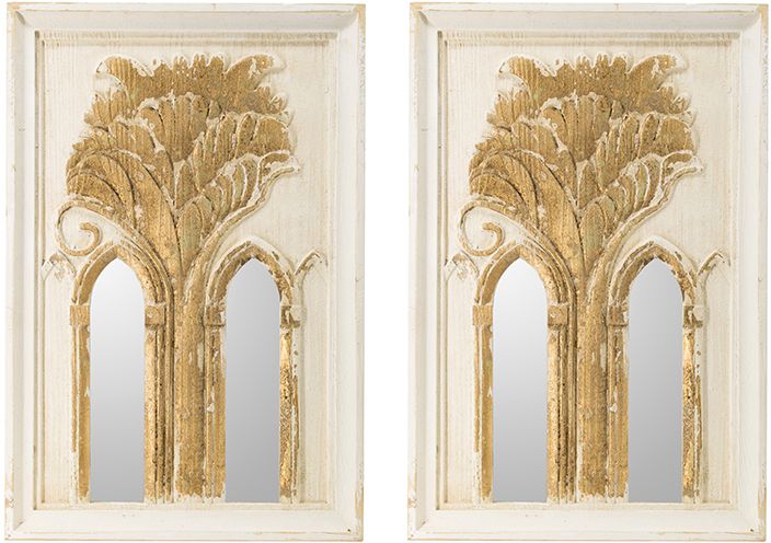 Warm gold leaf details add depth to this set of wall mirrors with a sophisticated natural aesthetic. The mirrors feature a washed white and gold finish that will enhance your homes traditional style. Place the set on walls above a console or sofa, an entryway or dining room.