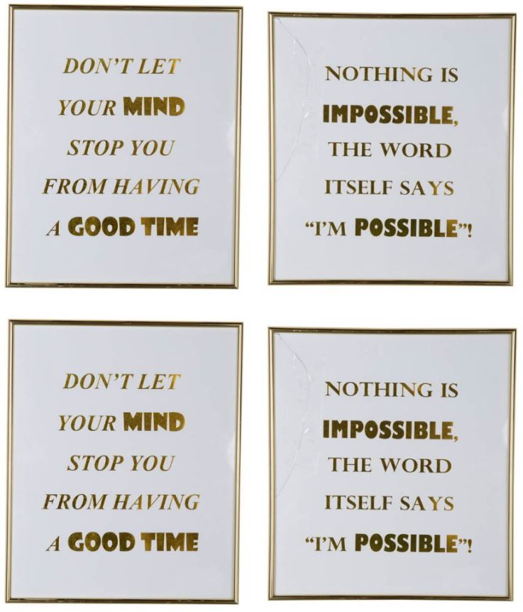 The A & B Home 4-piece gold/white mindful sayings wall art set is a stunning addition to any interior, radiating elegance and inspiration. Featuring intricate gold detailing on a pristine white background, these four pieces display profound, uplifting messages, adding a touch of serenity and sophistication to your living space.Read More