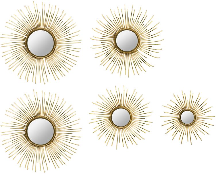 This set of 5 wire wall mirrors in a decorative sunburst shape make any bedroom or living room shine with vintage style. Inspired by a throwback favorite look, each features a metal sunburst frame that houses a center mirror and comes ready to hang. Arrange this set in various configurations to create an aesthetic depth and dynamism you’re sure to love.