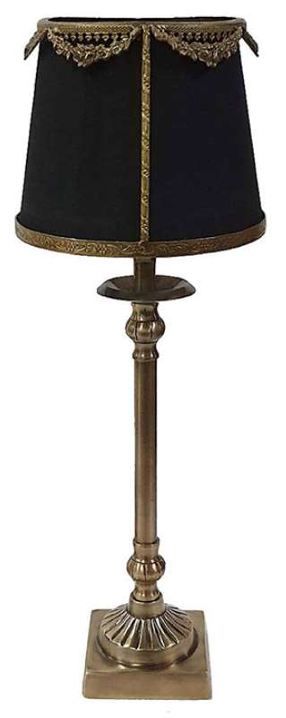 Traditional elegance comes to light in this antique brass ornate table lamp. A metal trim accents the classic tapered shade. The lamp is finished off with a metallic square base, perfect for a traditional living room, bedroom, or foyer.Read More