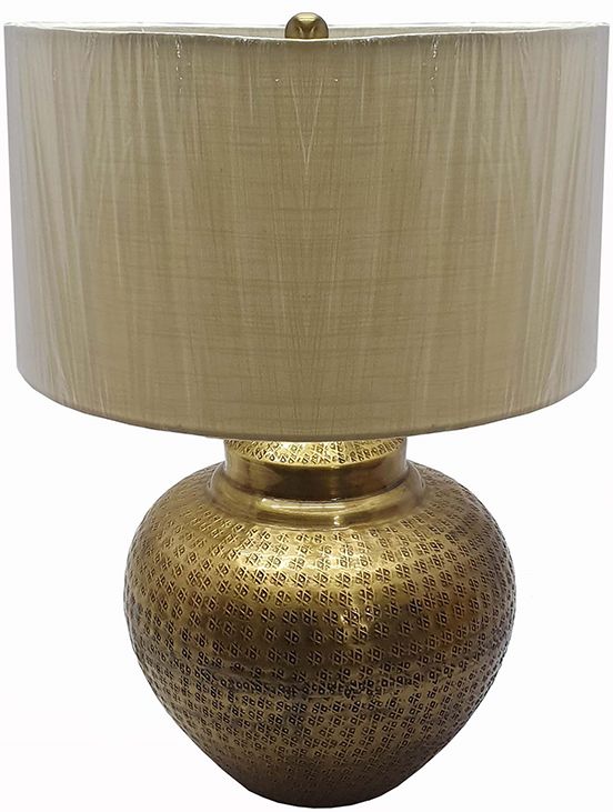 This aluminum matki table lamp features a dimple pattern round motif base that’s finished in an elegant antique brass for a transitional appeal. Crafted with a strong adherence to eye-pleasing geometry, this lamp is topped with a beige tone round drum shade that gives it proportion and balance. It’s a wonderful bedside solution that’s versatile enough for living rooms and other statement spaces.