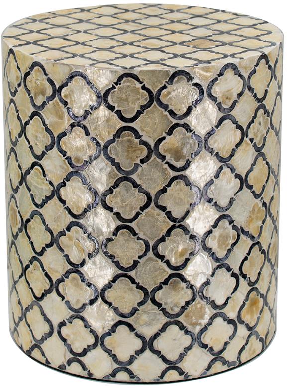 With diamond patterning through the black and cream frame, this round accent stool with Capiz inlay is attractive and sensible. The perfect addition to a modern family room, this piece can serve as either an end table or a stool.Read More