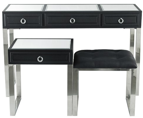 A chic tufted bench and gorgeously designed nested tables make up this stylish three-piece set. The legs of both the nested tables and the bench are made from stainless steel with a silver finish, while the table tops are crafted from premium beveled clear glass mirrors.Read More