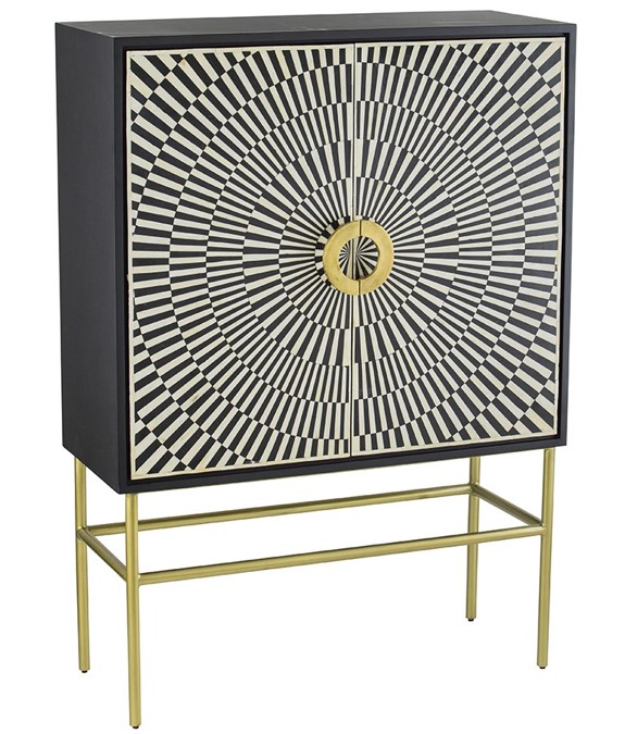 From the brass and iron frame to the eye-catching bone inlay, this two-door bar cabinet is a transfixing piece of art deco decor. Sunray detailing gives texture to the entire body, while the mixed materials create beautiful accenting across the frame.Read More