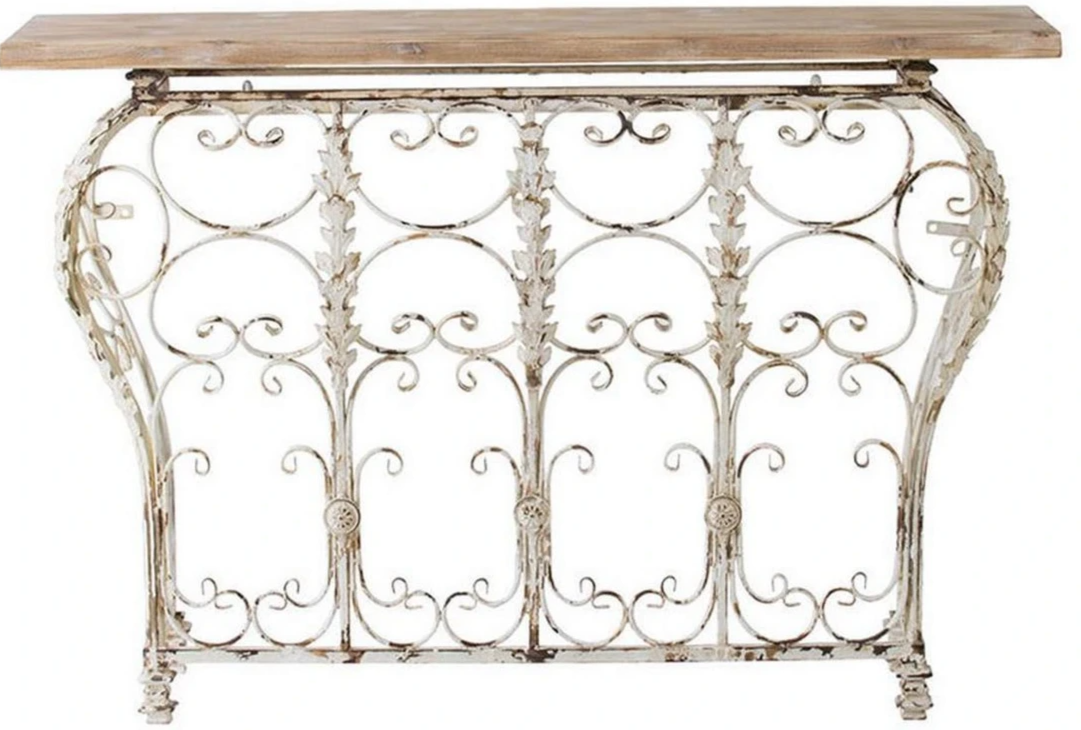 The curved base of this console table has intricate scrollwork that elevates its sleek and elegant style with a floral and leaf design. The metal base has an antique white finish that’s paired with a rectangular wood tabletop.Read More