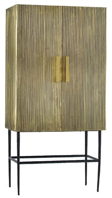This tall, stoic cabinet features a mix of brass and iron with scalloped detailing that adds vibrance to the vintage aesthetic. The frame is thin and tall, with slender legs that exaggerate the streamlined design. An excellent piece for storage and decor, ideal for living and dining rooms.Read More