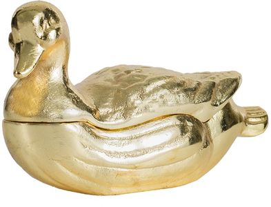 Put a whimsical spin to your decor with this duck shaped trinket box. Made of aluminum with a polished gold finish, this statuette serves as a decorative accent for any tabletop or shelf. It makes a charming addition to any home, from traditional to modern.