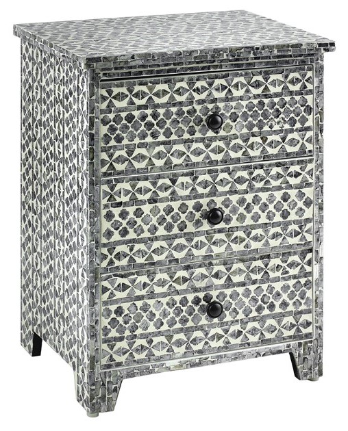 Add drama and functionality to your room with the Janus three drawer chest. Crafted in gray and ivory it features a graphic capiz design formed from meticulously inlaid peices with three drawers for added functionality. Perfect for an art deco retreat or contemporary bohemian room.Read More