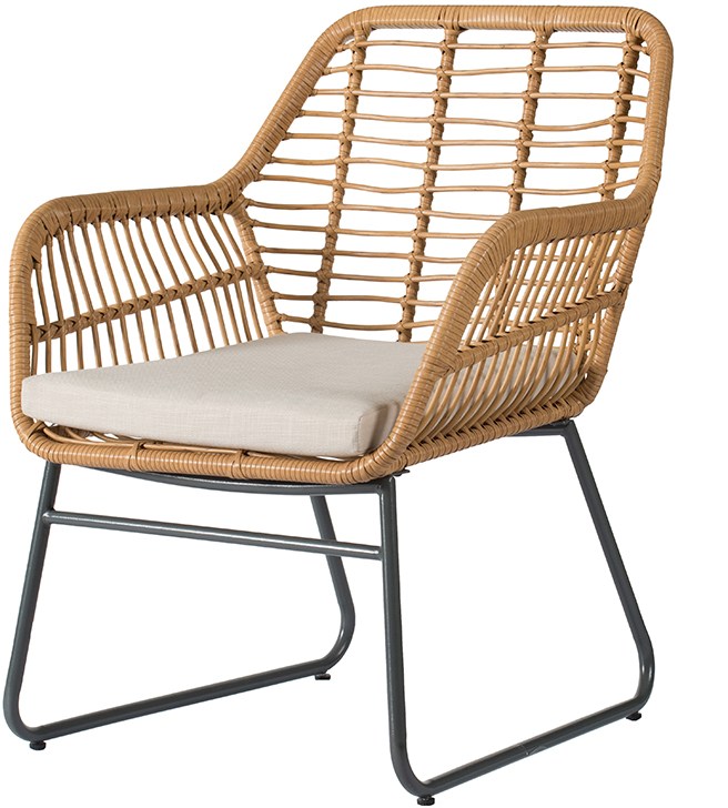 Get the comfort you need and the farmhouse feel you love with this natural wicker armchair. The deep shell hosts a soft cushion, tall armrests and a sloping back, offering exceptional comfort and support. The sleigh base complements the curving design of the chair, while the black finish on the frame offers an appealing accent to the muted tones above.