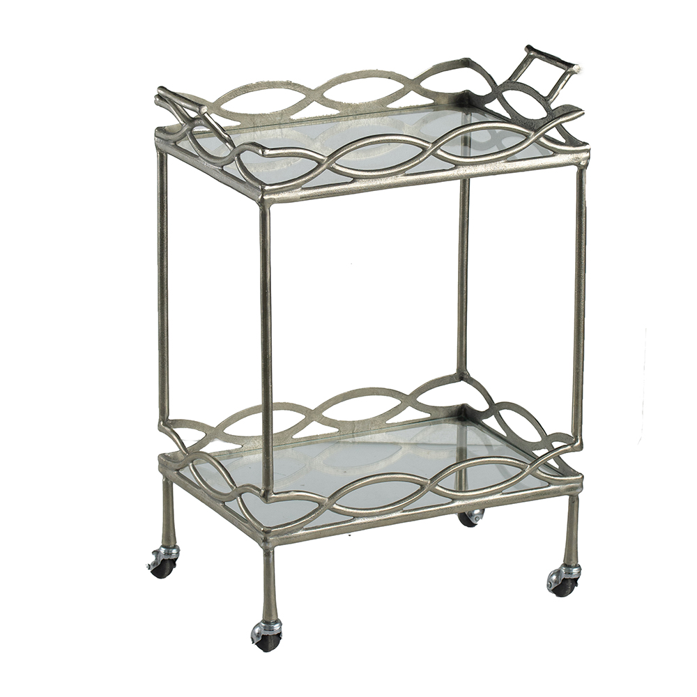 Entertain like a professional with the attractive functionality and thoughtful design of this silver bar cart, which comes in a nickel finish. This two-tiered bar cart is made of aluminum and glass, and also features two shelves and a handle on each end for easy mobility.Read More