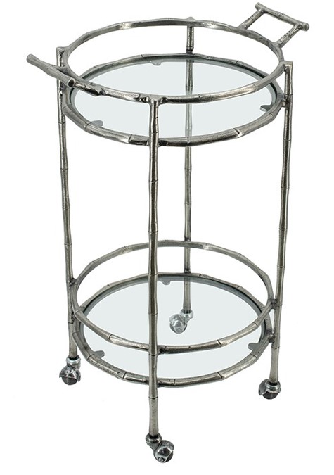 A silver antique finish lends a sleek look to a Natural-inspired bar cart made of aluminum and glass. Complete with a functional two-tiered design with two shelves, it also comes equipped with handles. Entertain with style and sophistication by placing this mobile bar cart in the kitchen, dining room, or living room.Read More