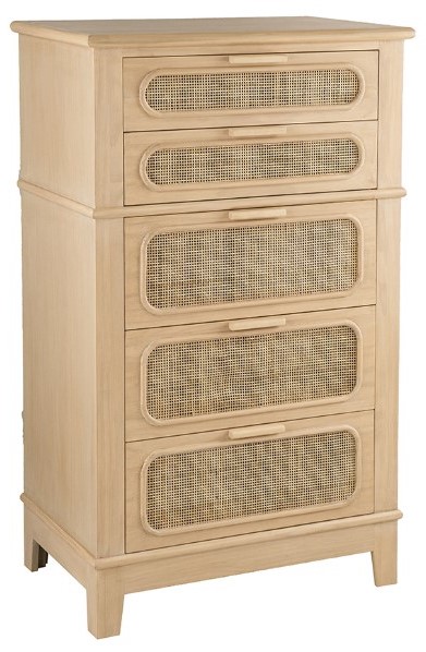 The Stanislaw tall chest draws inspiration from the relaxed yet sophisticated lifestyle of the coast. Traditional designs suggest an air of familiarity, but the styling is fresh and fashionable. The product offers a light pine wood veener as well as caning inset on the drawers for a bohemian feel with a mid-century flair.Read More