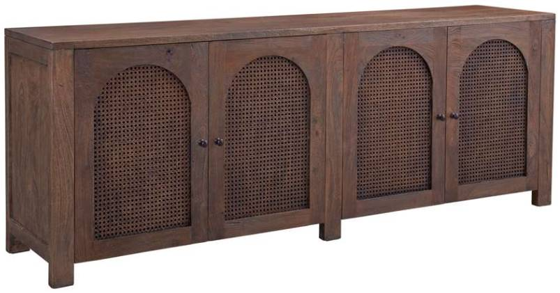 Introducing the Walsh server, a blend of rustic modern farmhouse design that adds warmth to your space. Crafted from solid mango wood, it boasts a delicate antique walnut stain finish. The four doors feature arched open cane inserts for character. Inside, find practicality with two adjustable shelves and media cord management.Read More