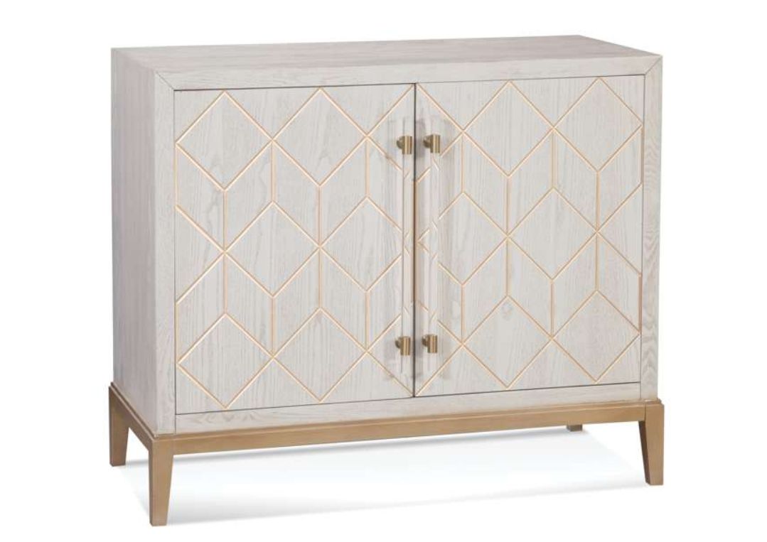 The Perrine White Bar Cabinet combines organized bar storage with a touch of elegance, featuring antique gold geometric
