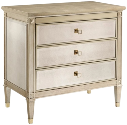 This nightstand is a beautiful reflection on your style. The case exemplifies a modern interpretation of linear Italian design with the addition of a lustrous Auric silver leaf finish and beveled antique mirror facades. This carved chest features three soft-close drawers with custom-designed square metal/mirrored pulls.Read More
