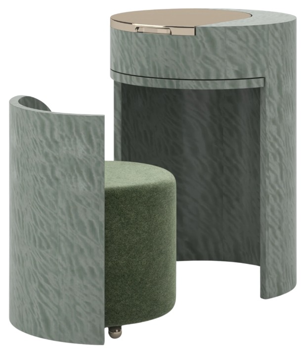 Experience a harmonious blend of artistic luxury and graceful functionality with the absinthe vanity. Its captivating case finished in verdigris swirl is accented by refined metal trim in whisper of gold, offering visual depth and rich texture. Featuring a lift-up top that reveals a clear mirror and practical storage.Read More
