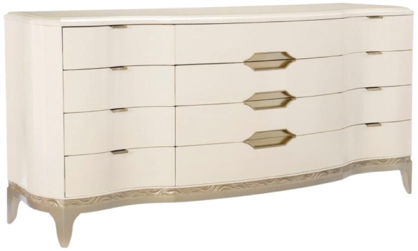 A modern interpretation on refined neoclassic design, this dresser is generously sized with twelve, self-closing drawers. It maintains its gracefulness with dramatically curving lines on the front and sides, as well as beautifully carved trapezoid feet.Read More