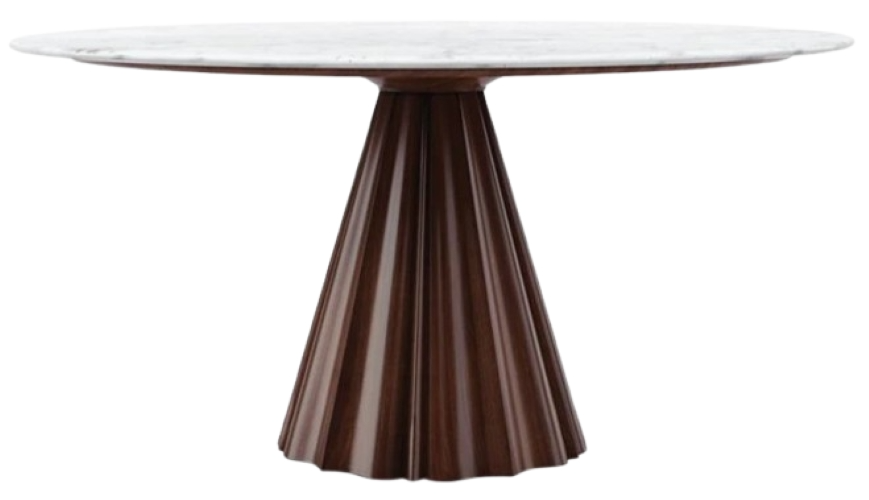 Designed with a reverse bevel, its veined white marble top creates the illusion of a thin stone resting on its conical base. Intimate and intentional, it elevates entertaining and quiet evenings in. Comfortably seats 4 to 6.