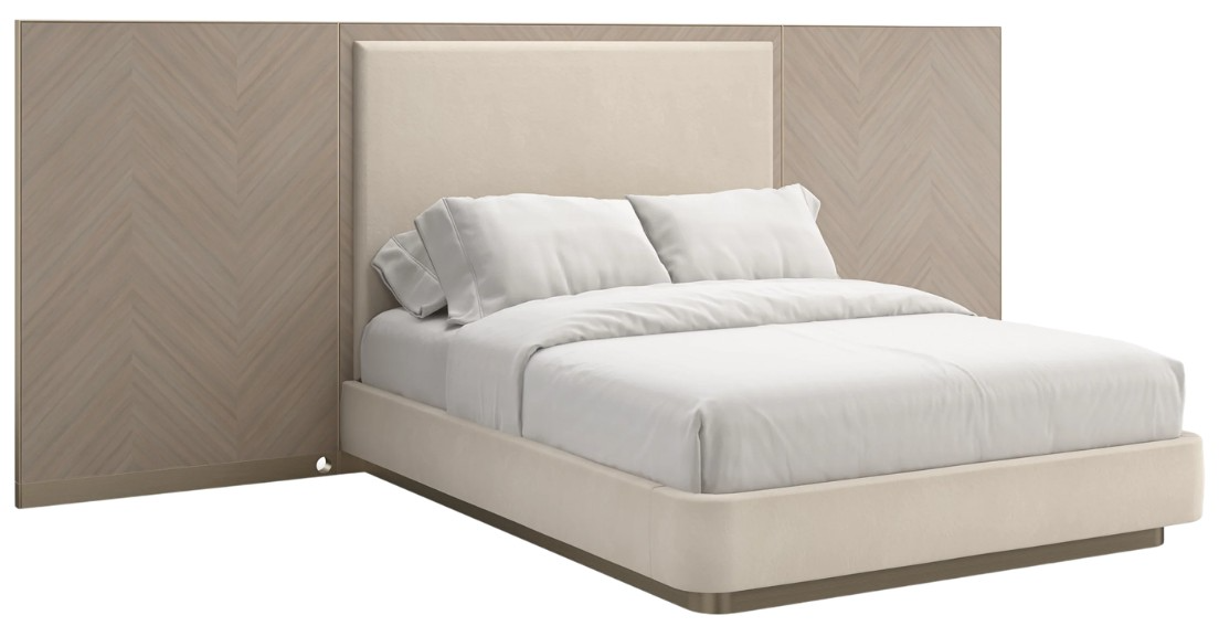 A storied collective of material and form, this classic bed introduces a calming neutral palette that is warm and inviting. Features paneled wings in Koto veneers with a chevron pattern inspired by early Greek motifs, framing a parsons-style headboard dressed in a soft yet durable wool-like flannel.Read More