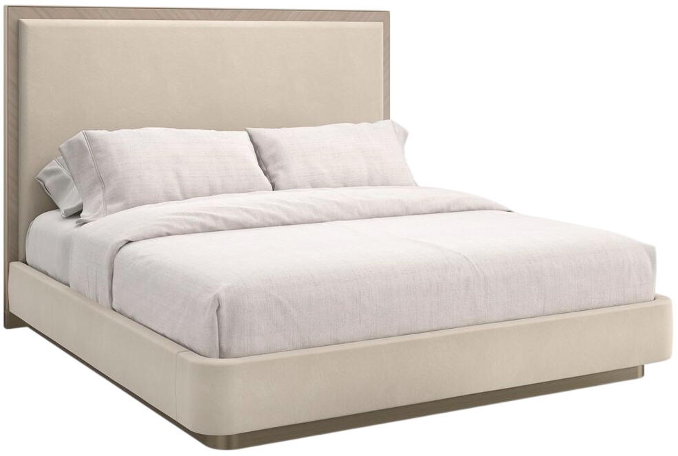 The Anthology king panel bed features an upholstered headboard, footboard, and siderails for a refined look. Exposed dry martini wood accents the headboard, enhanced with brushed gold metal trim, while a brushed gold plinth base adds a sophisticated finish.Read More