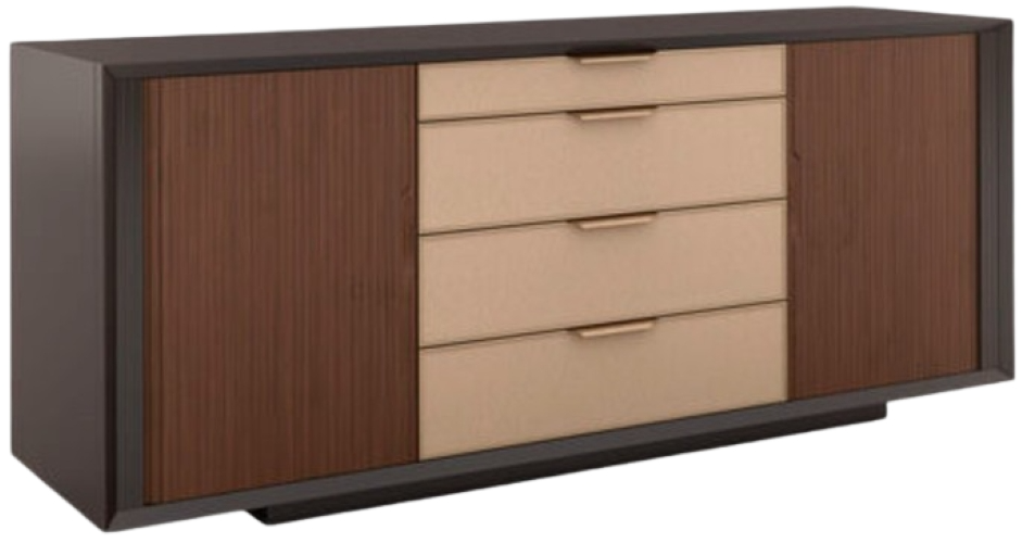 Tambour doors on each end in rich walnut with two fixed shelves on left side and five undermount soft close drawers on right side