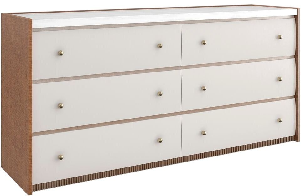 With a rustic elegance reminiscent of rural France, this dresser features tactile drawer fronts in a rockport burnished adobe finish. Drawing the eye to its architectural design: a striated white onyx marble top, warmly contrasted by end panels in toasted sycamore and an antique bronze leaf dentil molding detail along the base.Read More