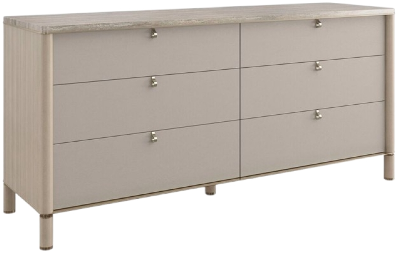 Light tones and organic textures in perfect balance exude a refined modern elegance. Soft-to-touch, vinyl wrapped drawers are complemented by Silver Platano wood veneers and a polished travertine stone top. Metal accents and a base in Lucent Bronze add warmth and subtle contrast to its calming, clean-lined form.Read More