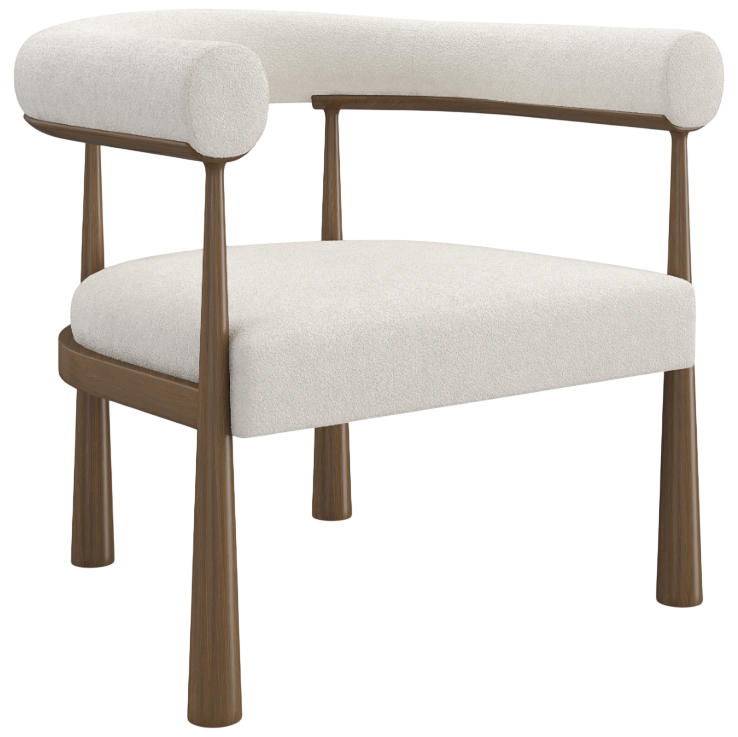 Its exposed wood frame and tapered legs lend a mid century modern detail, warmly complemented by an oatmeal melange boucle fabric.
