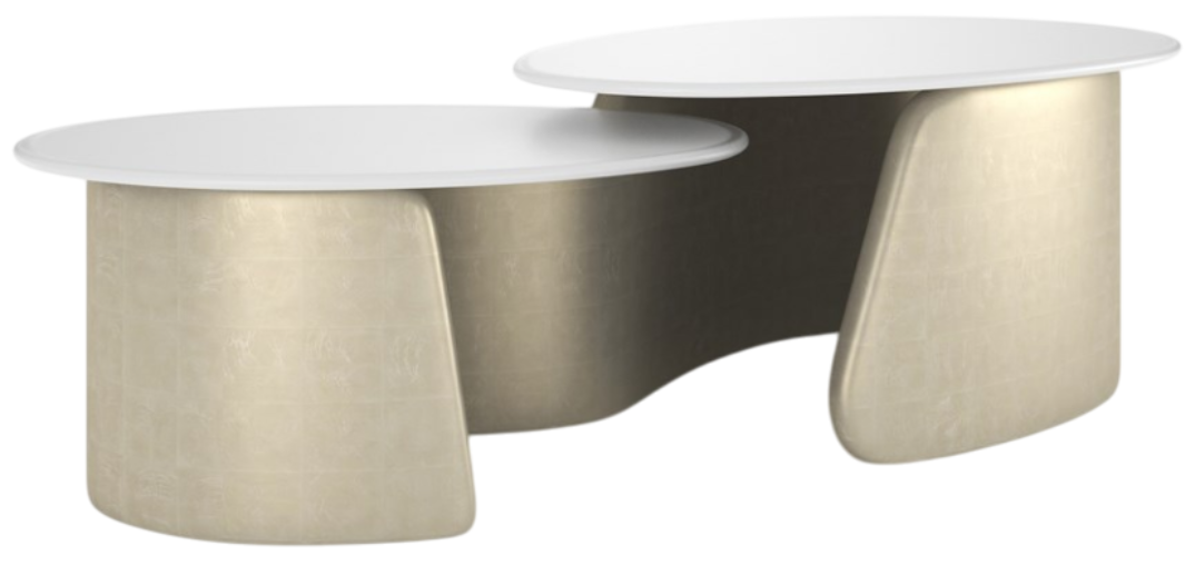 Two elliptical frosted glass tops, backed in white with delicate gold flecks, rest on an undulating base reminiscent of statement metal jewelry cuffs.