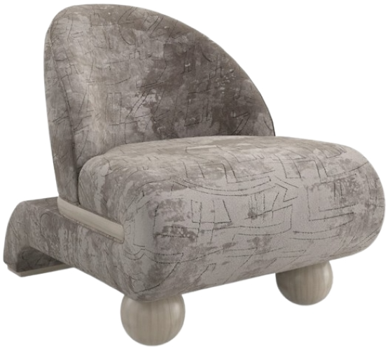 Balanced on two spheres, this shapely chair introduces a playful form with a bold modern aesthetic. When viewed from the side, its seemingly continuous curved lines are aptly defined by the soft sheen of cut velvet with an abstract Brutalist pattern. A back plinth leg and matching wood waist trim lend a distinct finishing touch.Read More
