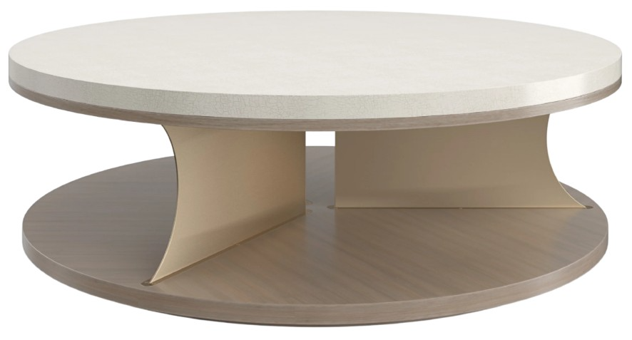 Understated yet elegant, this artful cocktail table is a celebration of materiality and simple form. Features an ample top in an Ivory Craze crackle finish, supported by a trio of Brushed Gold metal blades, perfectly distributed to create open space for storage and display. A swiveling plinth base adds intrigue and function.Read More