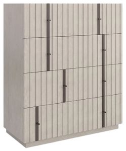 A harmonious mix of wood and metal, the clancy chest introduces an architectural element with layers of visual texture. Slatted details create depth and dimension, punctuated by open-grain oak in a neutral taupe finish. Features four stacked drawers with minimal pull panels in matte black metal.Read More