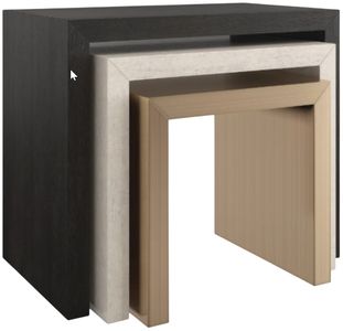 Graduating nesting tables introduce a striking contrast of texture, material and tone. Perfect for entertaining, each table makes its own statement: the larger table is finished in cinder; the medium table in cre`me travertine stone; and the smaller table is finished in lucent bronze metallic metal.Read More