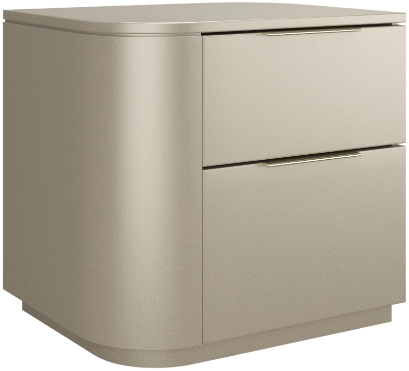 Clean and elegant, the Oblique Left Nightstand pairs rounded filleted edges with a combination of rectangular fronts. Fully-finished in iridescent soft silver paint gloss, this piece defies its simplicity and presents a graceful complement to any bedroom. Discrete brushed whisper of gold metal pulls are stamped with the Caracole logo.Read More