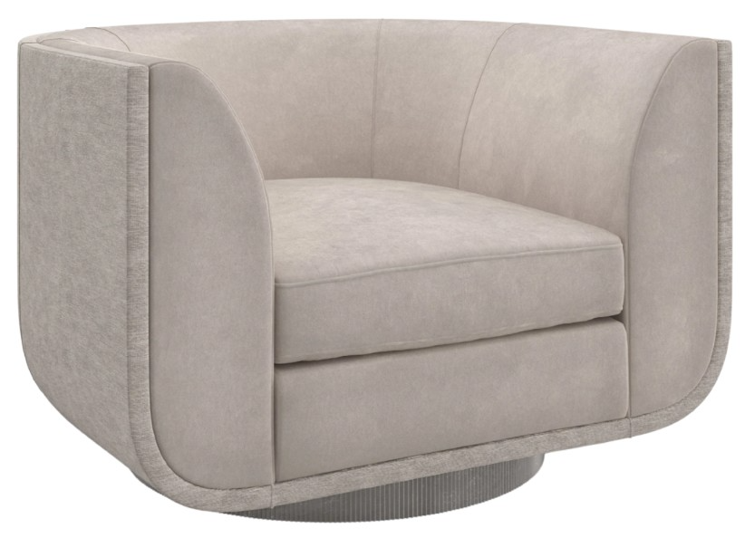 With a Space Age-inspired design, this shapely swivel chair calls to mind the undulating, curvaceous aesthetic of an era that fused art and imagination with progress and innovation. Meticulously tailored, its streamlined silhouette is accentuated by a taupe faux-mohair velvet on the inside, and a tactile silver metallic fabric along the outside and back.Read More