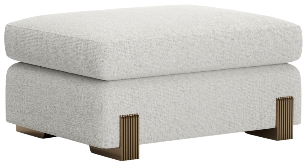 Elevate your comfort and style with the Counter Balance Ottoman in oatmeal melange woven fabric with subtle rust threading. Brushed Gold metal legs provide the perfect accent, blending sophisticated luxury and inviting comfort.Read More