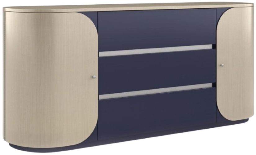 A high-fashion design with a sophisticated profile, this oval-shaped dresser introduces an Italian modern aesthetic and a bold pop of color to bedroom interiors. Painted drawer fronts in a Prussian blue hue add depth to its sleek and simple form, accentuated by subtly curved doors in a thunder-finished veneer.Read More