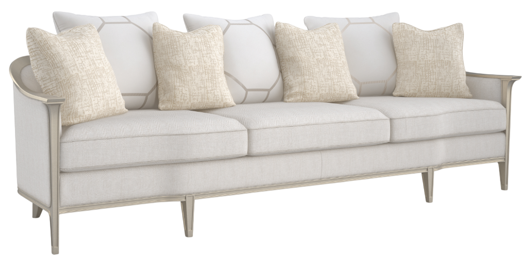 Classic details converge with graceful curves for a sophisticated style that invites comfort and the most formal of gatherings. A carved wood frame in metallic soft silver guides the eye and accentuates its refined silhouette, dressed in a luxe herringbone fabric and creamy velvet wrapping the outside back.Read More