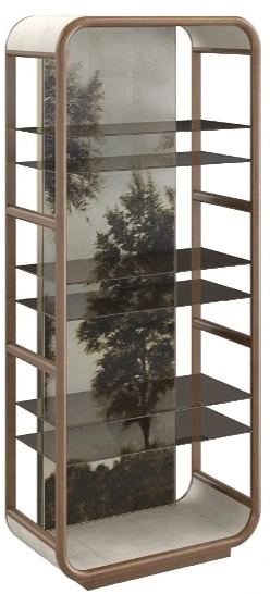 With a hand-painted back panel inspired by landscape paintings of the 17th Century, this bookcase introduces an ethereal aesthetic to living interiors. Offers ample space for open storage and display with six Smoked Bronze glass shelves that appear to float within its rounded, wood frame.Read More