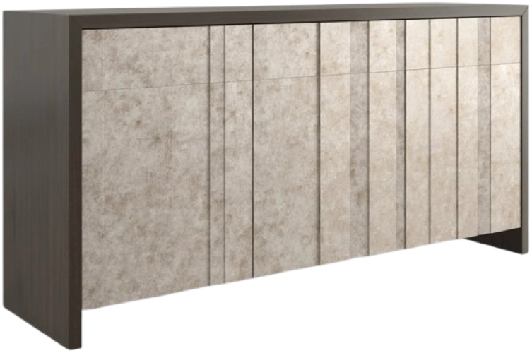 With a warm shimmer reminiscent of mica minerals, this multifaceted sideboard introduces an interplay of light and shadow. Applied by hand, Intricately pieced silverleaf wraps touch-latch doors and drawers of varying dimensions for added depth and reflection.Read More