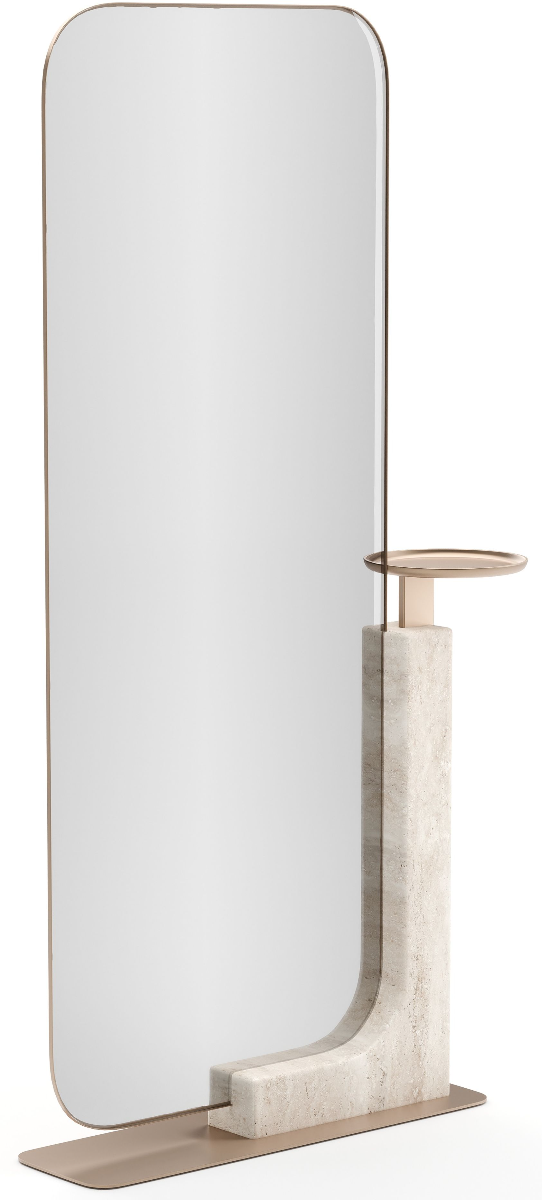 Elevate your interior with the refined charm of the overlap floor mirror light. Beautifully framed in luminous whisper of gold, this freestanding mirror brings radiant elegance to any space. Supported gracefully by a distinctive stand of unfilled travertine stone, each mirror showcases natural variations, offering a truly unique aesthetic.Read More