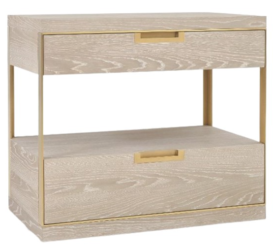 Crafted from Oak Solids and Narrow Heart Oak Veneer the Cadence Two Drawer Nightstand features Antique Brass trim wrapping around the two separate soft close drawers, and serving as the supports for the suspended top. Antique Brass drawer pulls are recessed into each drawer.Read More