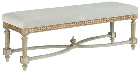 The Corbett bench is an traditional Italian inspired design featuring hand carved rosettes, repetitive leaf motifs and fluted legs. The finish is an aged sage green and antique cream paint with gold leaf accents on the carving. The seat is in a taupe velvet fabric.Read More