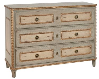The Corbett chest is a beautiful piece featuring three large scaled drawers accented with decorative brass finished pulls and escheons, two-tone scrubbed grey and cream paint finish, hand carved rope and leaf moldings accented with gold-leafing.Read More